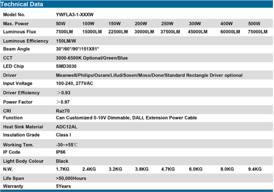 | Aplicações | Iluminação de paisagens, túneis, campos de futebol, iluminação de paredes externas |